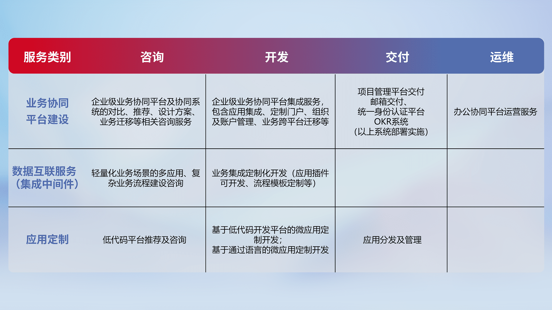 针对钉钉、、、、企微、、、、IDaas等平台级产品提供产品的规划、、方案、、、交付、、定制化开发等服务,,,实现如统一协同办公、、智能客户服务、、混合会议管理、、、、智能数据查询、、、、等业务场景,,实现数字化转型。。。。